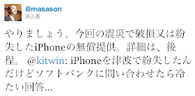 ソフトバンクグループ各社は、東北地方太平洋沖地震・長野県北部地震に対して、被災地支援を行っておられますが、先日つぶやかれたTwitterのつぶやき「iPhoneを津波で紛失したんだけどソフトバンクに問い合わせたら冷たい回答…」に対して、孫社長から「やりましょう。今回の震災で破損又は紛失したiPhoneの無償提供。詳細は、後程。」とツイートされ、無償提供が決まりました。上記画像はその時のツイッター画面。(参照元: ソフトバンク孫氏ツイッター)